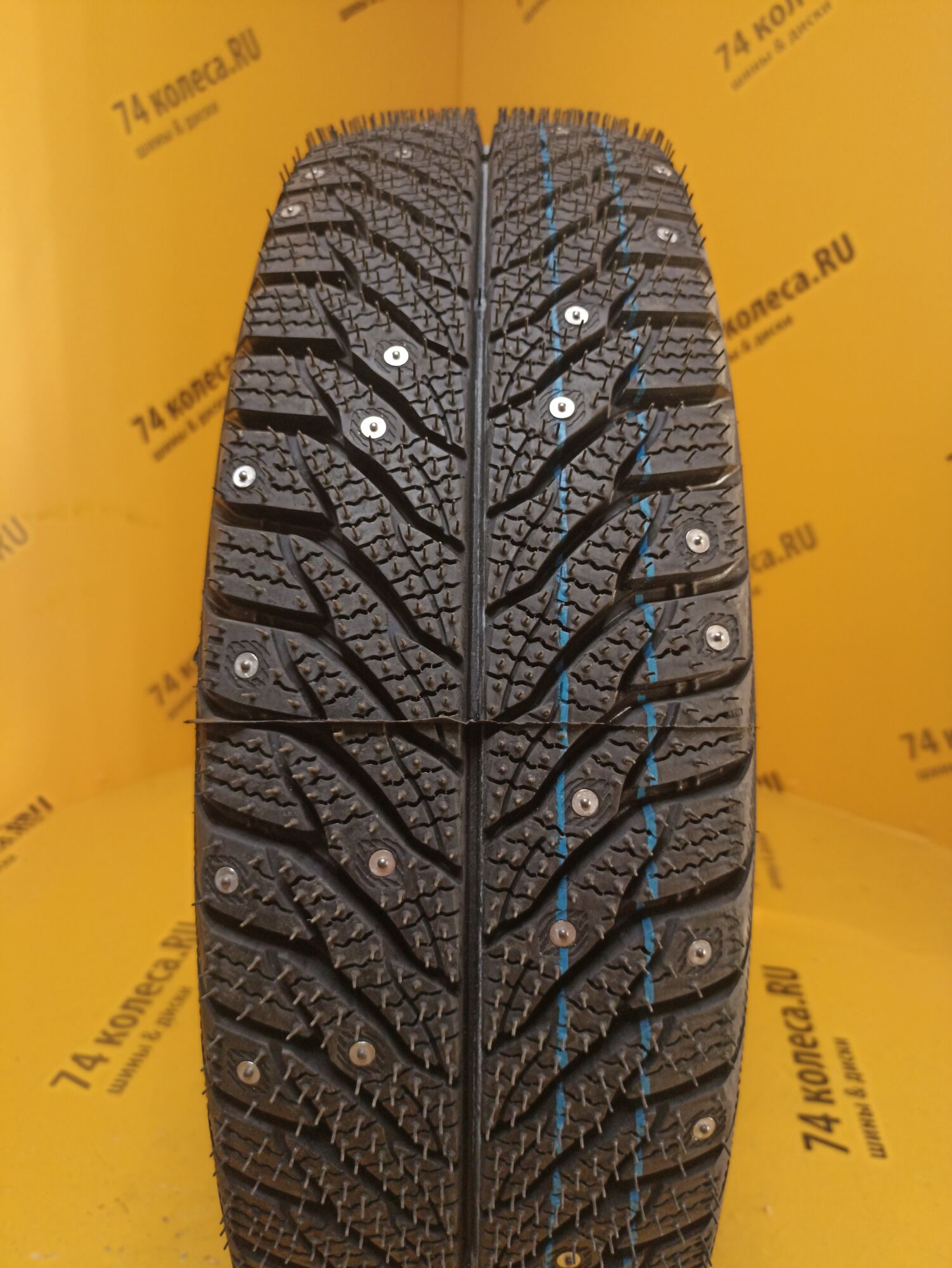 Низкий уровень шума при качении шины за счет смещения по вращению сторон рисунка протектора, применения набора элементов рисунка различной ширины и расстановки шипов противоскольжения.