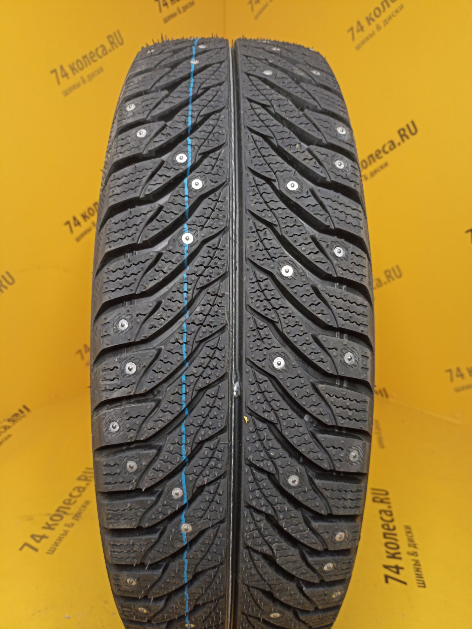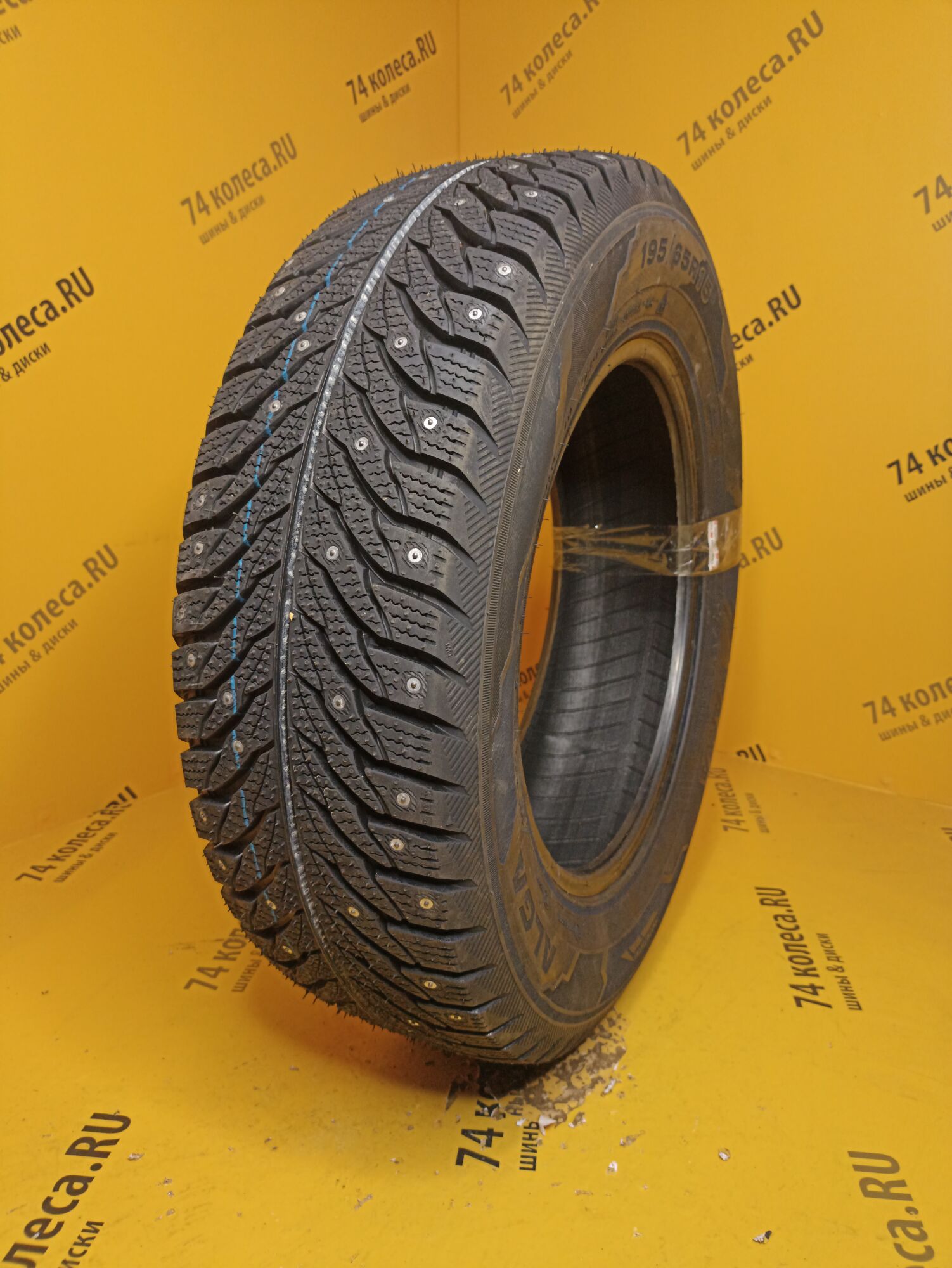 Низкий уровень шума при качении шины за счет смещения по вращению сторон рисунка протектора, применения набора элементов рисунка различной ширины и расстановки шипов противоскольжения.