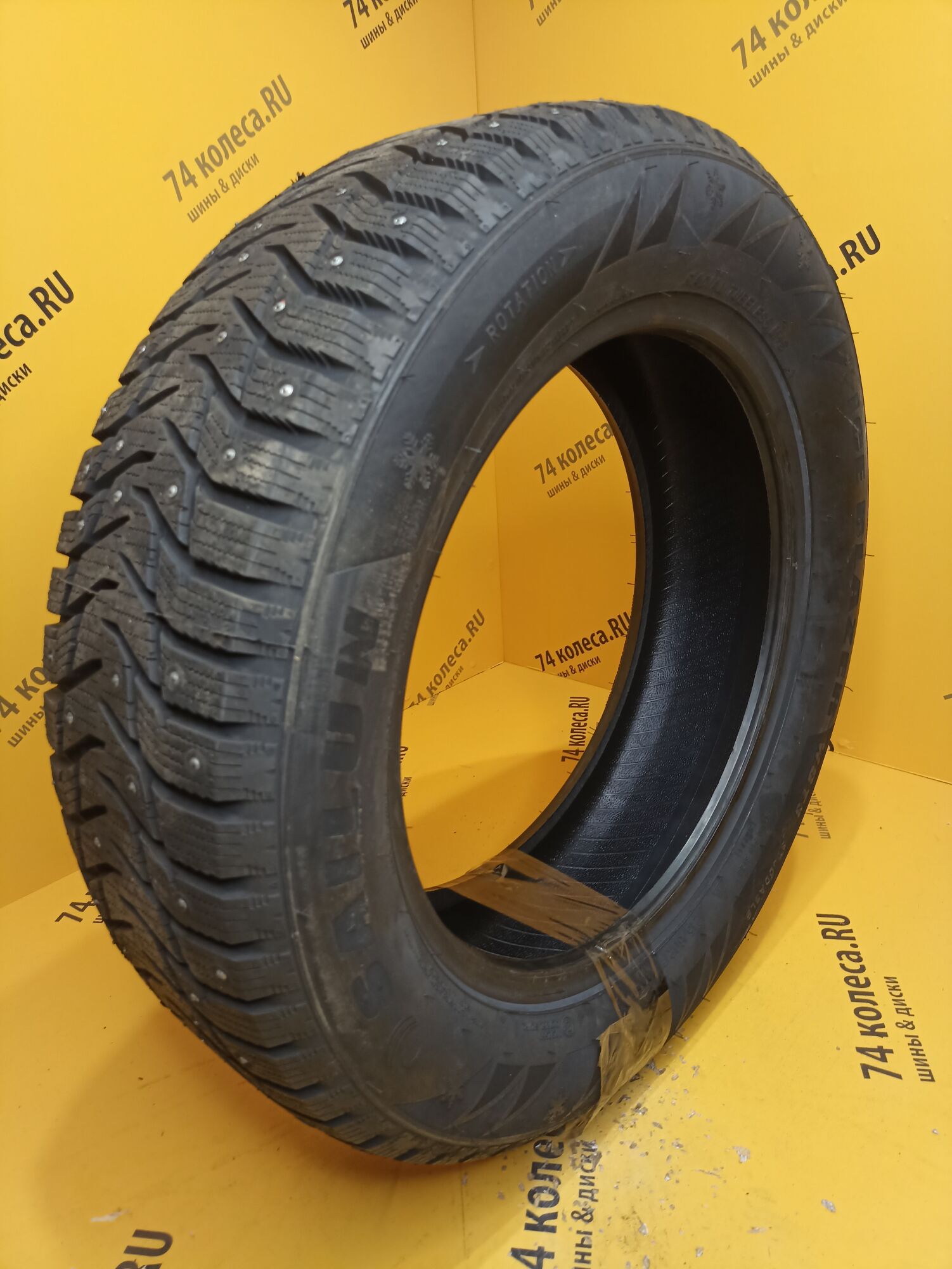Одной из характерных особенностей шины являются шипы. Схема их расположения подобрана так, что ими образуется 8 непрерывных рядов. При этом численность этих элементов была увеличена. И, чтобы не нарушать европейские требования к степени их воздействия на дорогу, азиатские шинники поступили точно так же, как и многие другие «коллеги по цеху» уменьшили размер контактирующей с поверхностью твердосплавной вставки. Еще одним заимствованием стала организация специальных зон вокруг мест установки шипов для интенсивного отвода ледяной крошки. Особые выступы на протекторе измельчают ее, что позволяет шине сильнее вгрызаться в обледенелое покрытие.